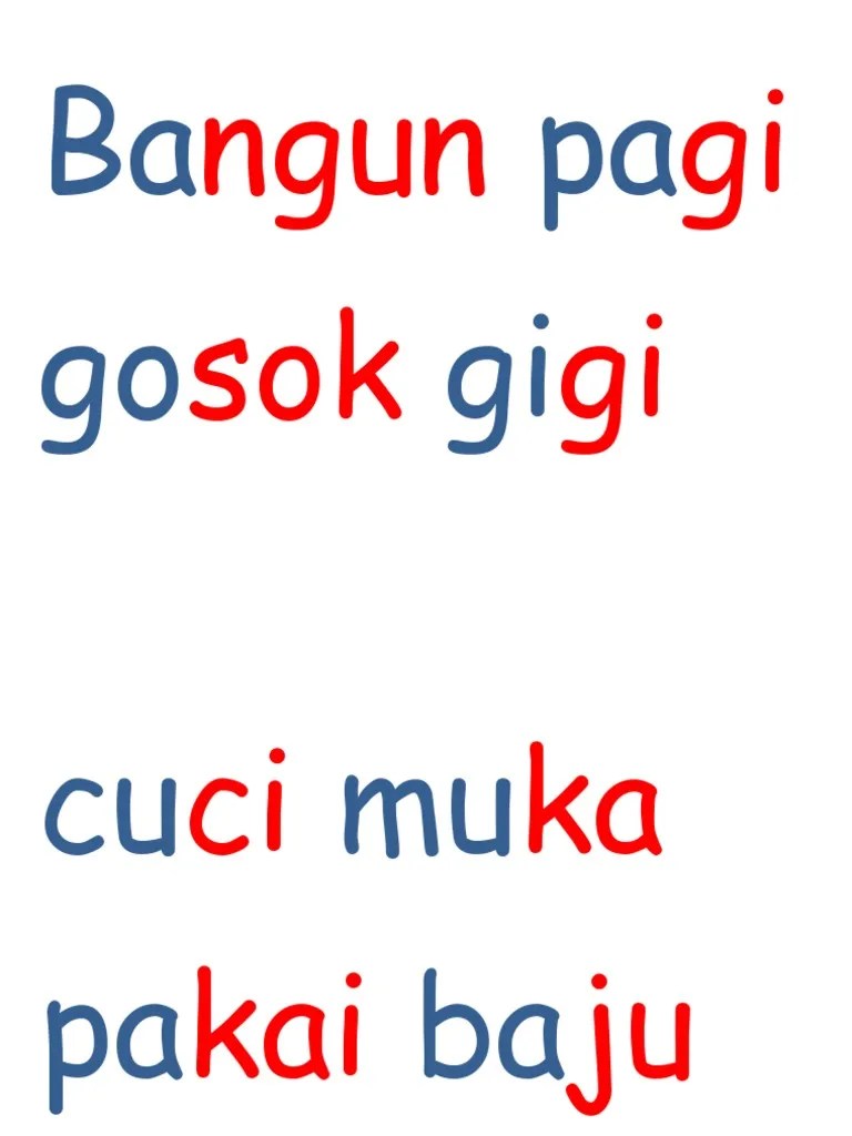 Bangun pagi gosok gigi cuci muka minum kopi. Lupa, dulu kekecik selalu nyanyi lagu tu masa basuh pinggan. Makan roti minum susu (eat bread drink . Minum susu salam ayah dan ibu pergi sekolah jalan kaki .